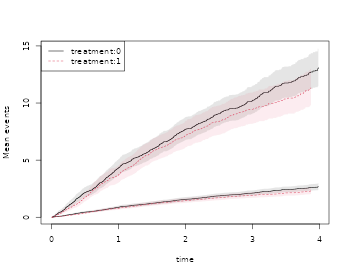 outN <- recurrentMarginal(Event(entry,time,status)~strata(treatment)+cluster(id),data=hf,